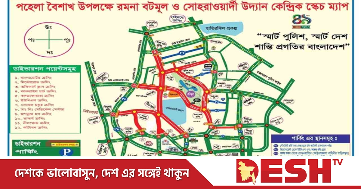 পহেলা বৈশাখ ১৪৩১ উদযাপন উপলক্ষে রমনা বটমূল ও ঢাকা বিশ্ববিদ্যালয় এলাকায় ঢাকা মেট্রোপলিটন পুলিশের (ডিএমপি) ট্রাফিক রমনা বিভাগের পক্ষ থেকে আগামীকাল রোববার (১৪ এপ্রিল) ১লা বৈশাখ ভোর পাঁচটা হতে বিকেল চারটা পর্যন্ত নিম্নলিখিত এলাকাসমূহে রাস্তা বন্ধ/রোড ডাইভারশন দেওয়া হবে।
