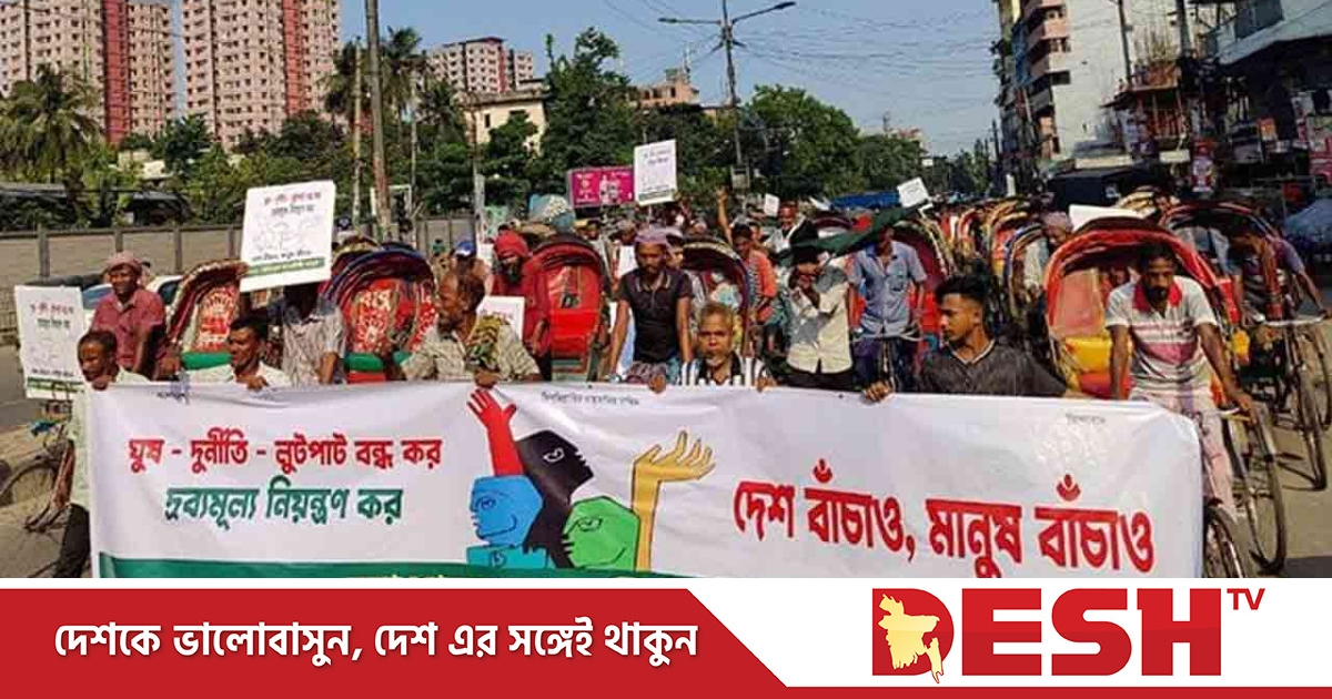 ঘুষ-দুর্নীতি-লুটপাট বন্ধ করে দ্রব্যমূল্য নিয়ন্ত্রণের দাবিতে রাজধানীতে বিক্ষোভ মিছিল করেছেন সাধারণ রিকশাচালকেরা।