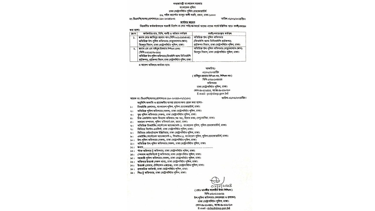 শনিবার (১ জুন) ডিএমপি কমিশনার হাবিবুর রহমান স্বাক্ষরিত এক আদেশে এই পদায়ন করা হয়।