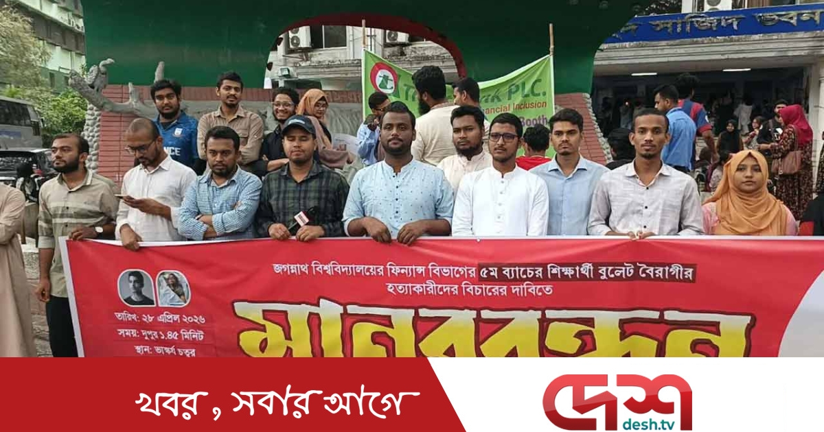 জগন্নাথ বিশ্ববিদ্যালয়ের ফিন্যান্স বিভাগের ৫ম ব্যাচের সাবেক শিক্ষার্থী ও কাস্টমস কর্মকর্তা বুলেট বৈরাগীর হত্যাকারীদের দ্রুত বিচারের দাবিতে মানববন্ধন করেছে জগন্নাথ বিশ্ববিদ্যালয় কেন্দ্রীয় শিক্ষার্থী সংসদ (জকসু)।