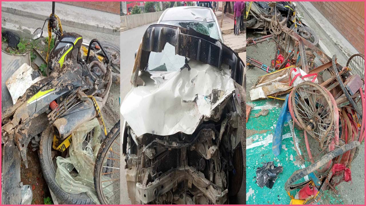 দুর্ঘটনা কবলিত মোটরসাইকেল-রিকশা ও প্রাইভেটকার