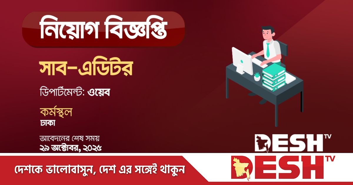 পদবি : সাব-এডিটর কাজের ধরন : ফুল টাইম ডিপার্টমেন্ট : ওয়েব বেতন : আলোচনা সাপেক্ষে কর্মস্থল : ঢাকা দায়িত্বসমূহ: • নিউজ সংগ্রহ, লেখা, সম্পাদনা ও সমন্বয় করা, • যে কোনো ব্রেকিং নিউজ দ্রুত লিখতে পারা এবং নিউজ তৈরি করা; • সারা দেশের যে কোনো ঘটনার সংবাদ বিশ্লেষণ তৈরি করা; • ডেস্কের কাজে সমন্বয় করা। শিক্ষাগত যোগ্যতা : আগ্রহী প্রার্থীকে স্বীকৃত কোনো বিশ্ববিদ্যালয় থেকে ন্যূনতম স্নাতক পাস হতে হবে। প্রয়োজনীয় দক্ষতা: • অনলাইন সাংবাদিকতা, সামাজিকমাধ্যম ব্যবস্থাপনা, সামাজিকমাধ্যম কমিউনিটি গাইডলাইন সম্পর্কে অবহিত থাকা; • আকর্ষণীয় শিরোনাম তৈরি ও ছবি সম্পাদনায় (ফটোশপ) পারদর্শী হতে হবে; • পাঠকের চাহিদা অনুযায়ী ভালো কনটেন্ট তৈরির ধারণা থাকা; • সারাদেশের ঘটমান বিষয়ে সচেতন থাকা; • সমস্যা সমাধানের ক্ষেত্রে বিশ্লেষণধর্মী চিন্তাশক্তি থাকা; • অনলাইন ও আইটি সংশ্লিষ্ট বিষয়ে প্রাথমিক ধারণা থাকা। অভিজ্ঞতা: ৩ বছর। অন্যান্য সু্যোগ-সুবিধা: ● উৎসব বোনাস: ২ টি (সর্বমোট বেতনের ৫০%) ● বার্ষিক বেতন বৃদ্ধি ● মোবাইল বিল আবেদনের নিয়ম: আগ্রহী প্রার্থীদের ২৯ অক্টোবর, ২০২৫ তারিখ এর মধ্যে আবেদন ফরম পূরণ করে সিভি পাঠাতে হবে নীচের লিঙ্কের মাধ্যমে। আবেদনের লিংক: https://tinyurl.com/subeditor29oct25