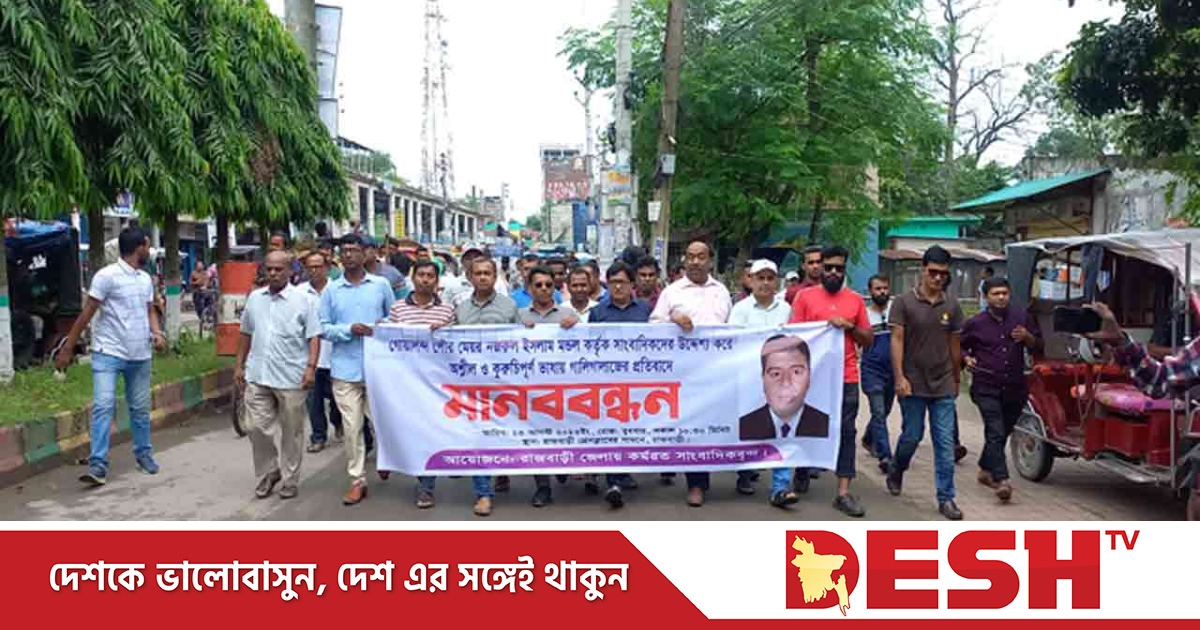 মানববন্ধনে রাজবাড়ী প্রেসক্লাবের সভাপতি অ্যাডভোকেট খান মো. জহুরুল হকের সভাপতিত্বে বক্তব্য দেন জেলা আওয়ামী লীগের সহ-সভাপতি বীর মুক্তিযোদ্ধা ফকির আব্দুল জব্বার, সাংবাদিক জাহাঙ্গীর হোসেন, আবু মুসা বিশ্বাস, মোশাররফ হোসেন, করিম ইছাক, লিটন চক্রবর্তী, সমীত্র শীল চন্দন, আজু শিকদার, রুবেলুর রহমান প্রমুখ।