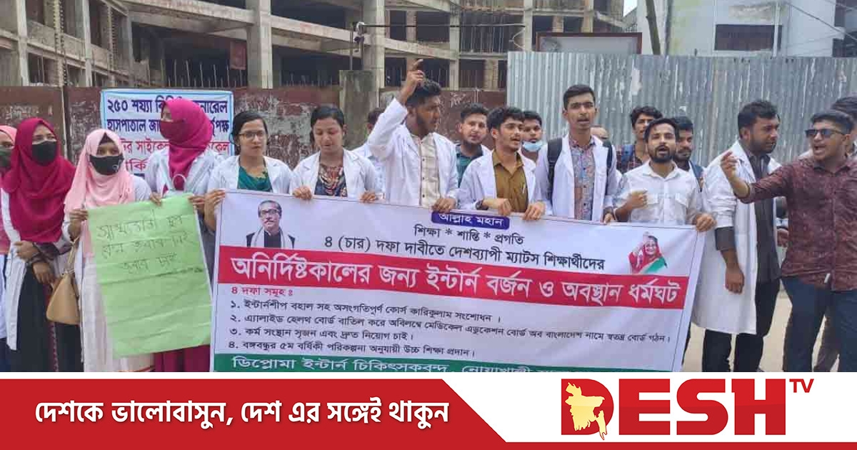 ইন্টার্নশিপ বহাল, কর্মসংস্থান নিশ্চিত করা, নতুন নিয়োগ শুরু করাসহ চার দফা দাবিতে ইন্টার্ন ডিপ্লোমা চিকিৎসকরা অবস্থান ধর্মঘট চলছে।