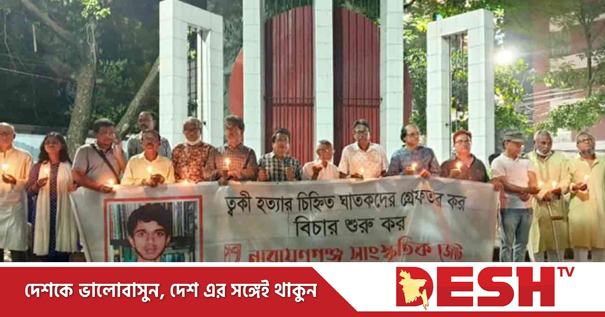 তানভীর মুহাম্মদ ত্বকী হত্যা ও বিচারহীনতার সাড়ে ১০ বছর উপলক্ষে আলোক প্রজ্বালন কর্মসূচি পালন করেছে নারায়ণগঞ্জ সাংস্কৃতিক জোট। গতকাল শুক্রবার (৮ সেপ্টেম্বর) সন্ধ্যায় নারায়ণগঞ্জ শহরের কেন্দ্রীয় শহীদ মিনারে এ কর্মসূচি পালিত হয়।