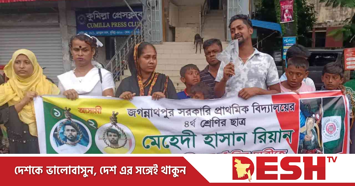 কুমিল্লার আদর্শ সদর উপজেলার জগন্নাথপুরের স্কুলছাত্র মেহেদী হাসান রিয়ানের হত্যাকারীদের দ্রুত বিচারের আওতায় এনে ফাঁসির দাবিতে মানববন্ধন করা হয়।