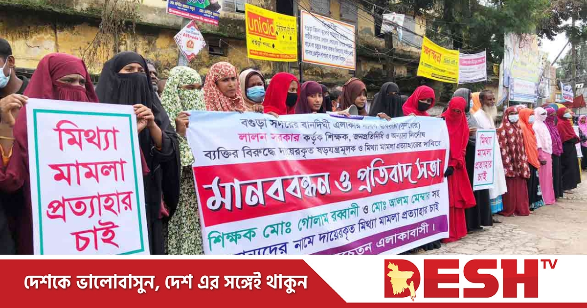 বগুড়ায় শিক্ষক গোলাম রব্বানী, এরুলিয়া ইউনিয়নের ইউপি সদস্য আলম শেখ ও নির্দোষ ব্যক্তির বিরুদ্ধে মিথ্যা মামলা দিয়ে হয়রানির প্রতিবাদে শনিবার (২৩ সেপ্টেম্বর) শহরের প্রাণকেন্দ্র সাতমাথায় বেলা সাড়ে ১১টায় মানববন্ধন ও প্রতিবাদ সভা করেছে বানদিঘী এলাকার সচেতন এলাকাবাসী।