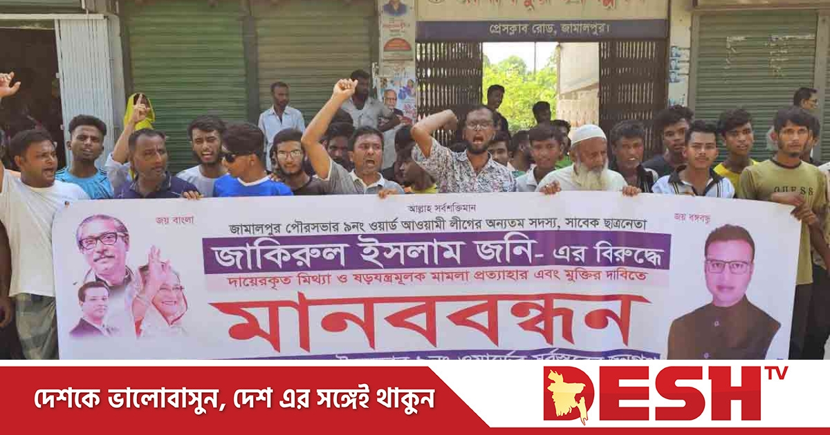 জামালপুরে আওয়ামী লীগ নেতা জাকিরুল ইসলাম জনির বিরুদ্ধে দায়েরকৃত মিথ্যা মামলা প্রত্যাহার ও মুক্তির দাবিতে মানববন্ধন এবং সড়ক অবরোধ করেছে বিক্ষুব্ধ এলাকাবাসী।