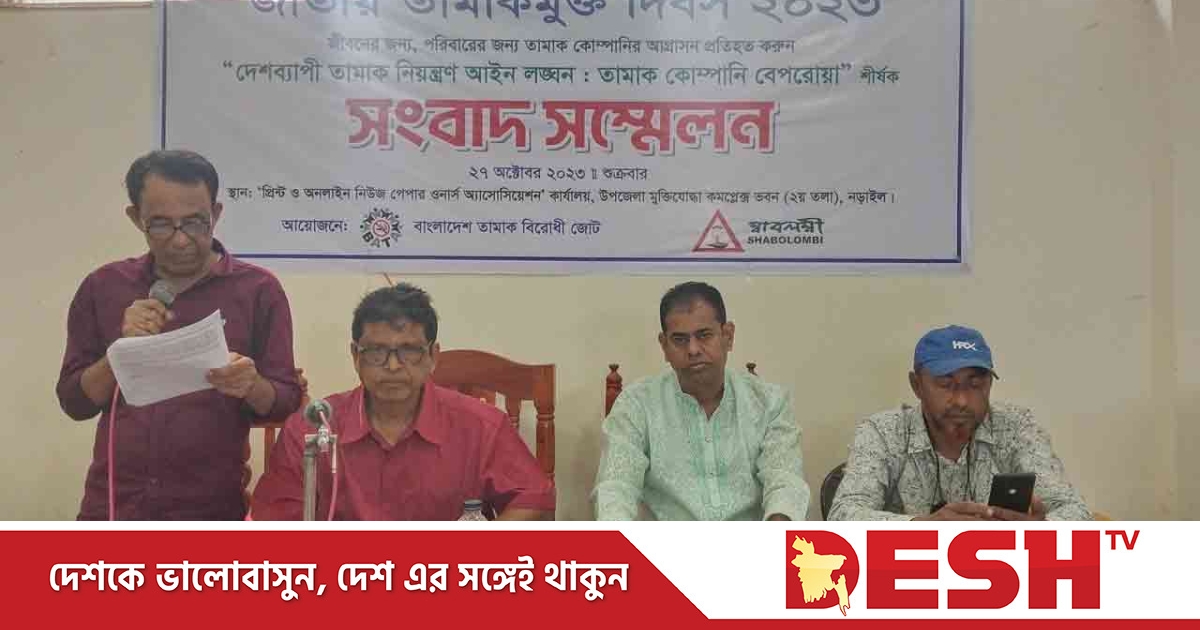 ‘দেশব্যাপী তামাক নিয়ন্ত্রণ আইন লঙ্ঘন: তামাক কোম্পানি বেপরোয়া’ এই স্লোগানে নড়াইলে জাতীয় তামাকমুক্ত দিবস ২০২৩ পালন উপলক্ষে নড়াইলে সংবাদ সম্মেলন অনুষ্ঠিত হয়েছে।