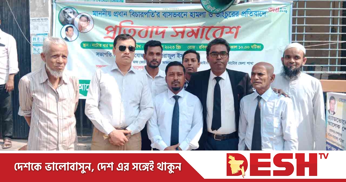 প্রধান বিচারপতির বাসভবনে হামলা ও ভাংচুরের প্রতিবাদে নাটোরে প্রতিবাদ সমাবেশ করেছে বঙ্গবন্ধু আইনজীবী পরিষদ।