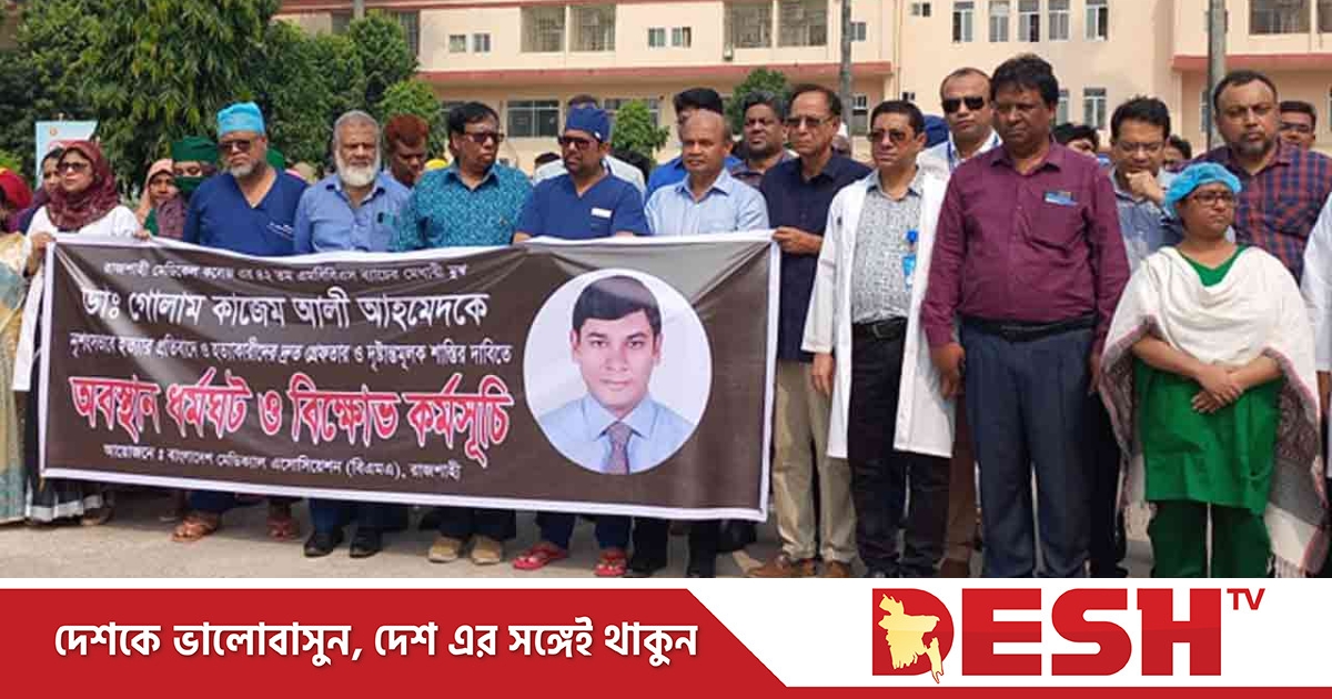 রাজশাহীতে ডা. গোলাম কাজেম আলী আহমেদ হত্যার প্রতিবাদে বিক্ষোভ কর্মসূচি পালন করেছেন চিকিৎসকরা।