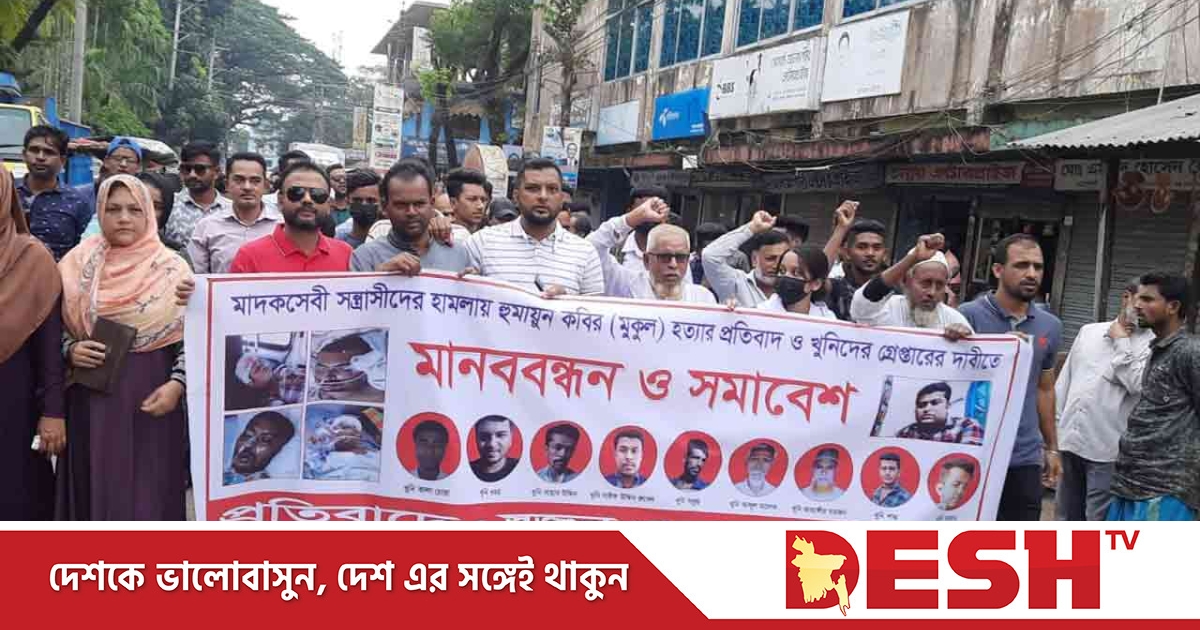 সন্ত্রাসীদের হামলায় হুমায়ুন কবির মুকুল (৩৪) হত্যার প্রতিবাদে ও খুনিদের বিচারের দাবিতে মানববন্ধন ও সমাবেশ করেছে নিহতের স্বজন ও এলাকাবাসী।
