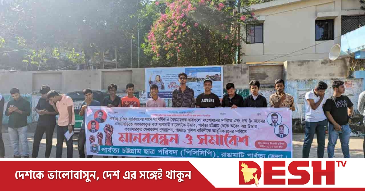পার্বত্য চট্টগ্রাম চুক্তিতে সংবিধানের সঙ্গে সাংঘর্ষিক ও বৈষম্যমূলক ধারাগুলো সংশোধনের দাবিতে মানববন্ধন ও সমাবেশ করেছে পার্বত্য চট্টগ্রাম ছাত্র পরিষদ (পিসিসিপি) রাঙামাটি জেলা কমিটি।