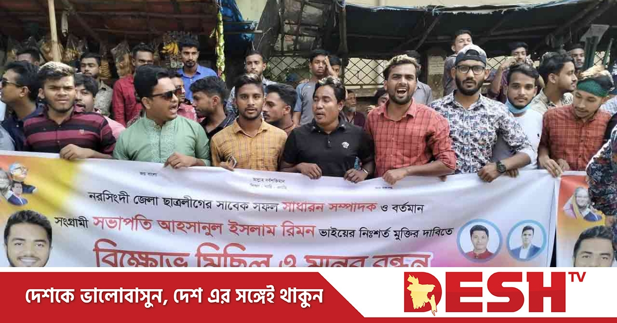 নরসিংদীতে নির্বাচনী আচরণবিধি ভঙ্গের মামলায় গ্রেপ্তারকৃত জেলা ছাত্রলীগের সভাপতি আহসানুল ইসলাম রিমনের মুক্তির দাবিতে বিক্ষোভ মিছিল ও মানববন্ধন করেছে ছাত্রলীগ।