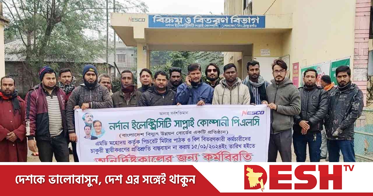 ঠাকুরগাঁওয়ে পিচরেট মিটার পাঠক ও বিল বিতরণকারীদের চাকরি স্থায়ীকরণের দাবিতে অনির্দিষ্টকালের কর্মবিরতি কর্মসূচি পালন করছে নর্দান ইলেকট্রিসিটি সাপ্লাই কোম্পানির (নেসকো) কর্মচারীরা।