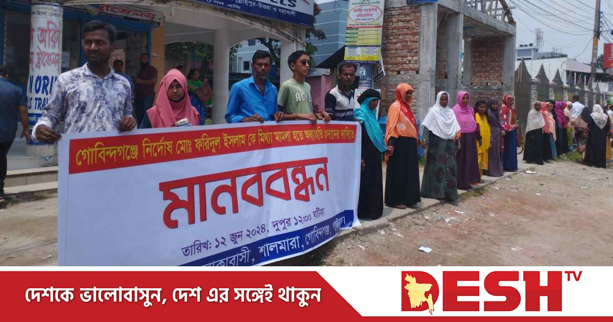গাইবান্ধা শহরের গানাস মার্কেটের সামনে বুধবার (১৩ জুন) দুপুরে নির্দোষ ফরিদুল ইসলামকে হত্যা মামলা থেকে অব্যাহতি চেয়ে এলাকাবাসীর উদ্যোগে মানববন্ধন অনুষ্ঠিত হয়। গাইবান্ধা জেলার গোবিন্দগঞ্জ উপজেলার শালমারা ইউনিয়নের আগউলিপুর গ্রামের এমরান আকন্দ হত্যা মামলার আসামি ফরিদুল ইসলামকে নির্দোষ দাবি করে হয়রানি করার প্রতিবাদে মামলা থেকে অব্যহতি প্রদানের দাবীতে মানববন্ধন অনুষ্ঠিত হয়।