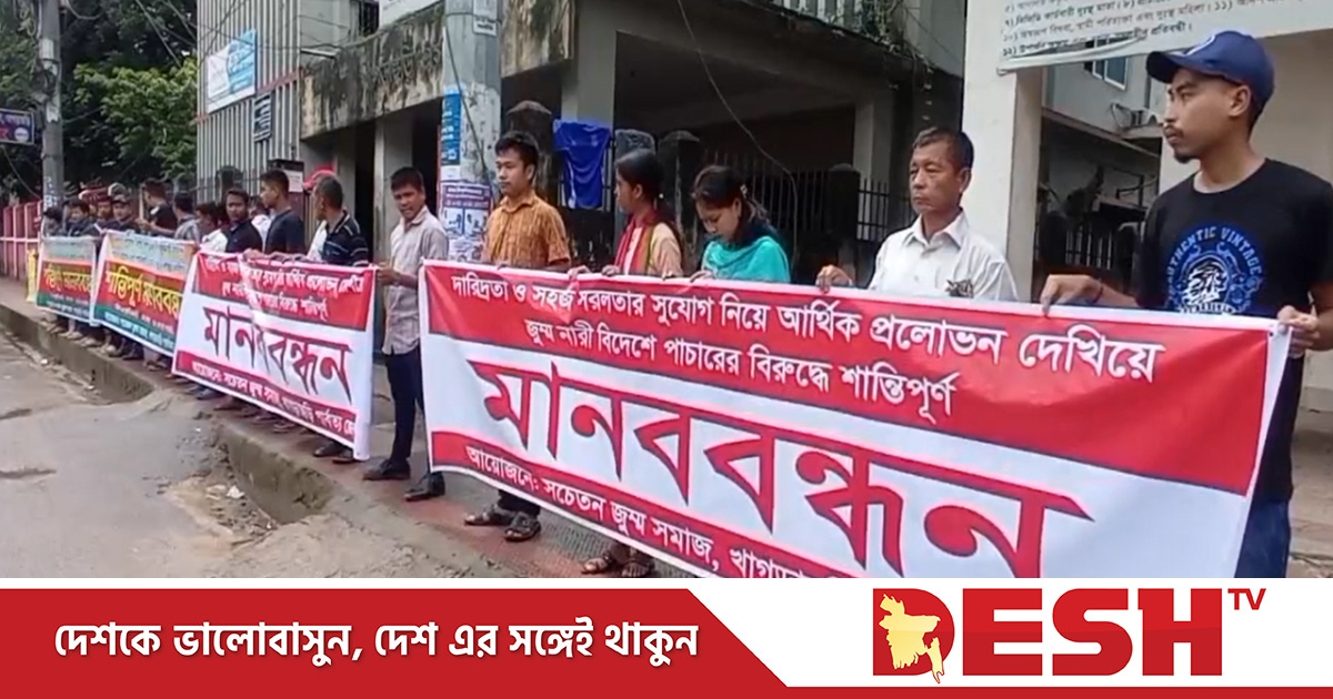 চীনে নারী পাচারের বিরুদ্ধে খাগড়াছড়িতে মানববন্ধন অনুষ্ঠিত হয়েছে। সোমবার (৮ জুলাই) সকাল ১০টায় খাগড়াছড়ি প্রেস ক্লাবের সামনে সচেতন জুম্ম সমাজের উদ্যোগে এ মানববন্ধন অনুষ্ঠিত হয়।