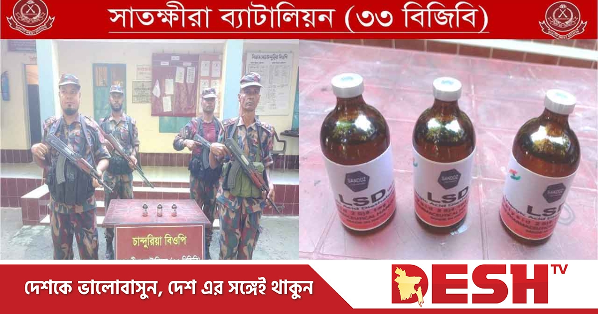 সাতক্ষীরার কলারোয়ায় বাংলাদেশ-ভারত সীমান্ত এলাকায় বিজিবি’র অভিযানে জব্দ হয়েছে ৩ বোতল ভারতীয় এলএসডি (লাইসার্জিক এসিড ডাইথ্যালামাইড) মাদক। তবে বিজিবির উপস্থিতি টের পেয়ে মাদক চোরাকারবারিরা পালিয়ে যায়।