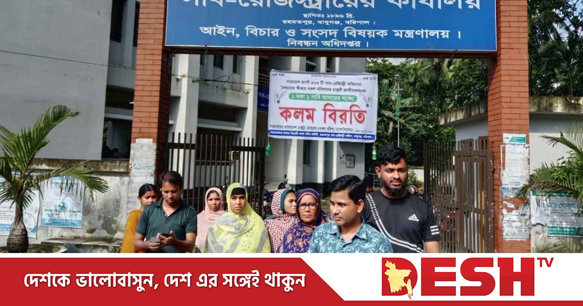 চাকরি জাতীয়করণের এক দফা দাবিতে এক দিনের কর্মবিরোধী পালন করেছে বরিশালের সকল সাব-রেজিস্ট্রার অফিসের নকল নবিশবৃন্দ।