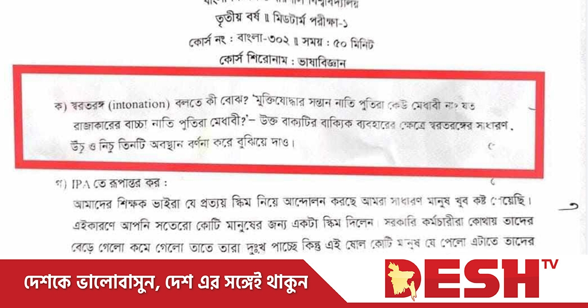 বিষয়টি সামাজিক যোগাযোগমাধ্যমে বেশ আলোচিত হচ্ছে। এমন সাহসী সৃজনশীল পদক্ষেপ নিয়ে প্রশংসা করছেন অনেকে। গত ২৮ আগস্ট করা প্রশ্নপত্রে বলা হয়, স্বরতরঙ্গ (ইনটোনেশন) বলতে কী বুঝ? ‘মুক্তিযোদ্ধার সন্তান নাতি-পুতিরা কেউ মেধাবী না? যত রাজাকারের বাচ্চা, নাতি-পুতিরা মেধাবী?’ উক্ত বাক্যটির বাক্যিক ব্যবহারের ক্ষেত্রে স্বরতরঙ্গের সাধারণ, উচু ও নিচু তিন অবস্থান বর্ণনা করে বুঝিয়ে দাও।