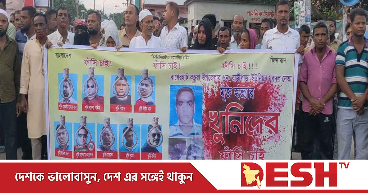 বাগেরহাটের কচুয়া উপজেলার রাড়িপাড়া ইউনিয়ন যুবদল নেতা মুক্তা উদ্দিন শেখের হত্যাকারীদের ফাঁসির দাবিতে মানববন্ধন ও বিক্ষোভ মিছিল অনুষ্ঠিত হয়েছে।