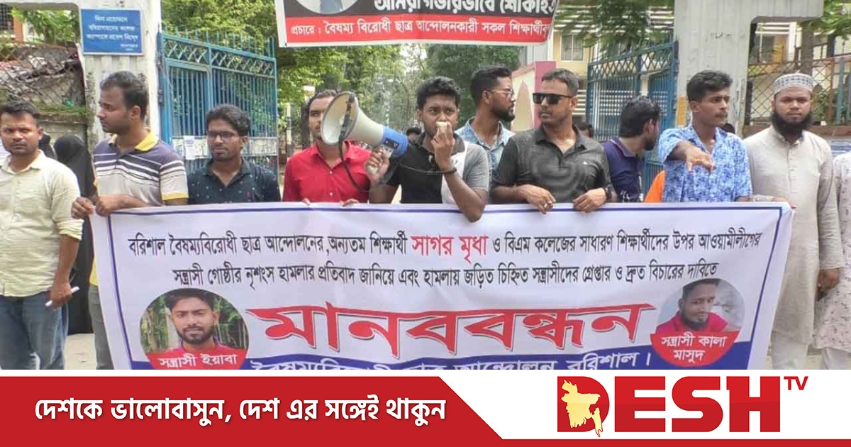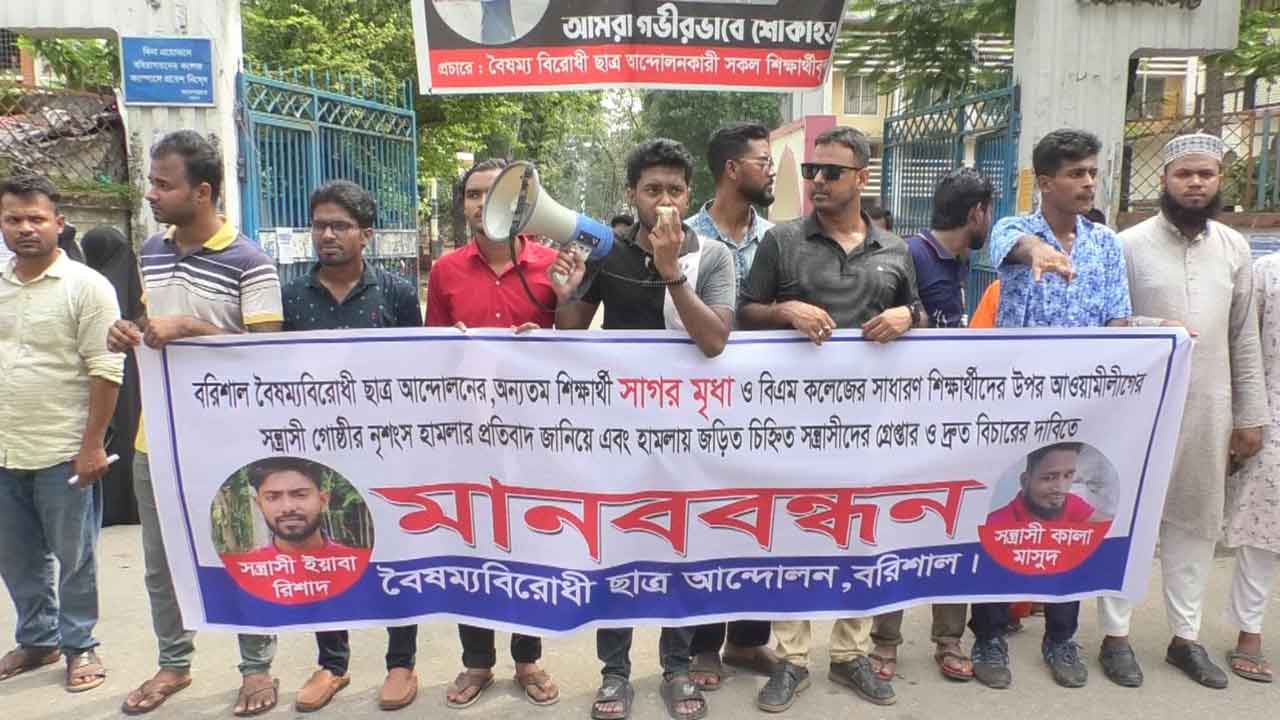 বরিশালে বৈষম্যবিরোধী ছাত্র আন্দোলনের সংগঠক সাগর মৃধা ও বিএম কলেজের সাধারণ শিক্ষার্থীদের ওপর আওয়ামী লীগের সন্ত্রাসী গোষ্ঠীর নৃশংস হামলার প্রতিবাদ এবং হামলায় জড়িত চিহ্নিত সন্ত্রাসীদের গ্রেপ্তার ও দ্রুত বিচারের দাবিতে মানববন্ধন করেছে বৈষম্যবিরোধী ছাত্র আন্দোলনে নেতৃত্ব দেওয়া শিক্ষার্থীরা।