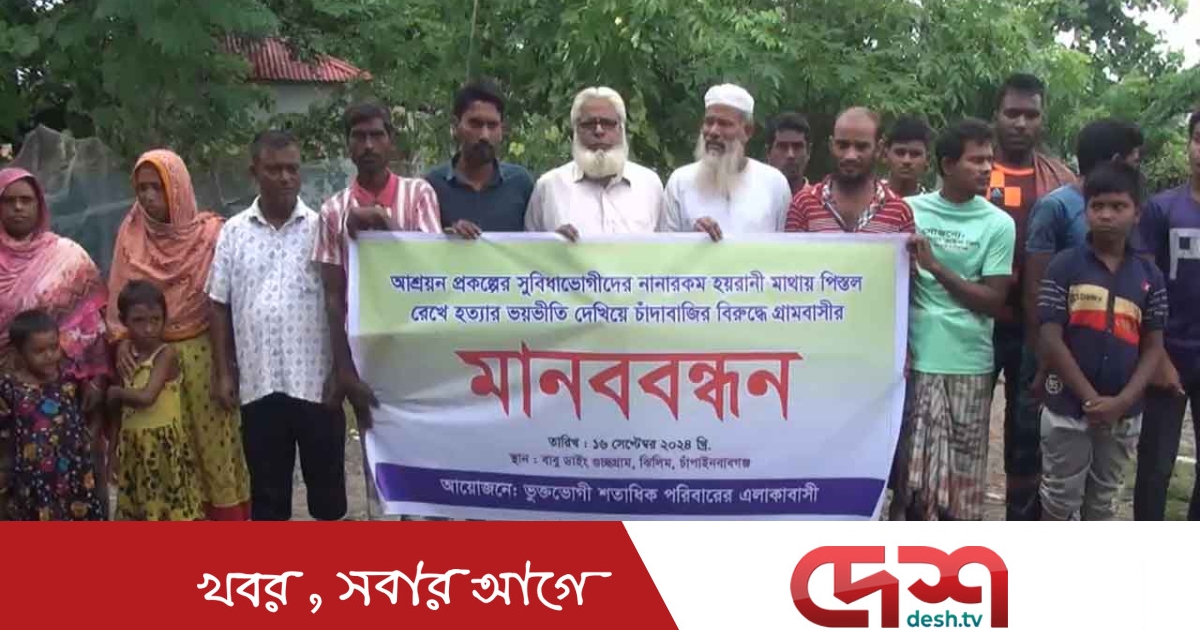চাঁপাইনবাবগঞ্জে ভূমিহীনদের জন্য দেওয়া আশ্রয়ণ প্রকল্পের এলাকায় মাদক ব্যবসার প্রতিবাদ করায় বাড়ি ও মসজিদের সীমানা প্রাচীর ভাঙচুর এবং সন্ত্রাসী বাহিনী মাথায় আগ্নেয়াস্ত্র ঠেকিয়ে ভয়ভীতির প্রতিবাদ জানিয়ে মানববন্ধন করেছে গ্রামবাসী।