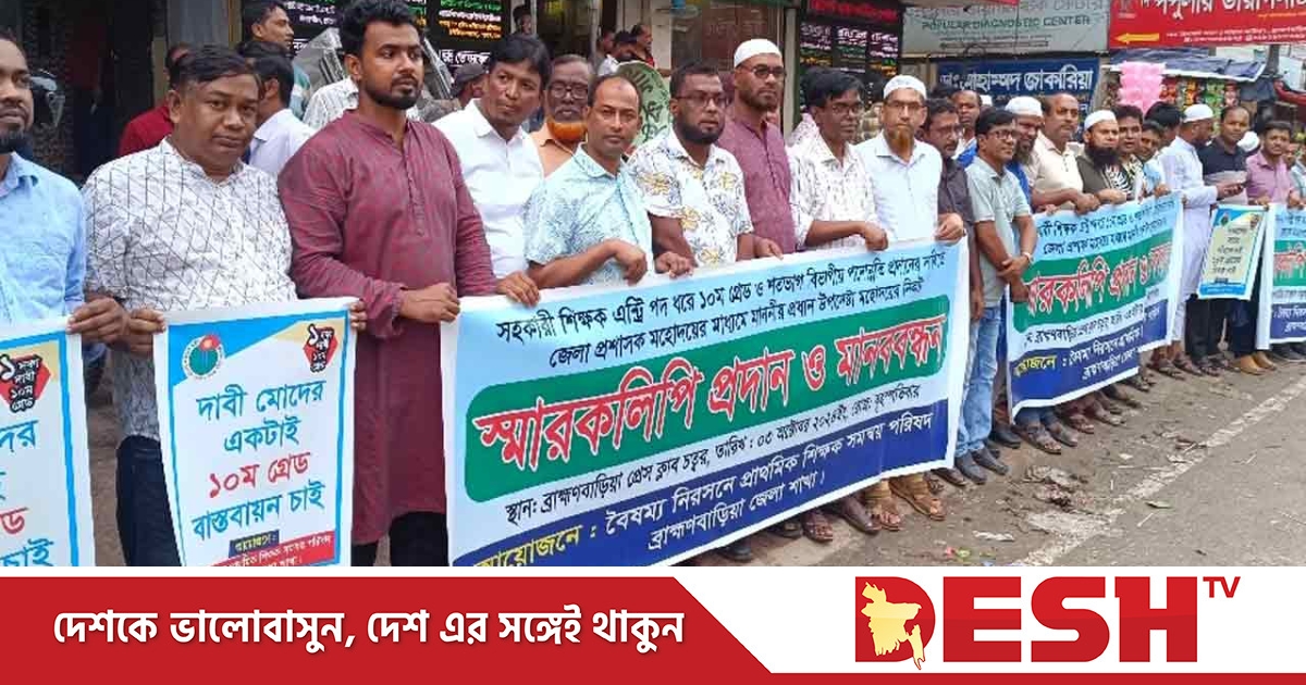 প্রাথমিক বিদ্যালয়ের সহকারী শিক্ষকদের ১০ম গ্রেডে ও শতভাগ বিভাগীয় পদোন্নতির দাবিতে ব্রাহ্মণবাড়িয়ায় মানববন্ধন অনুষ্ঠিত হয়েছে।