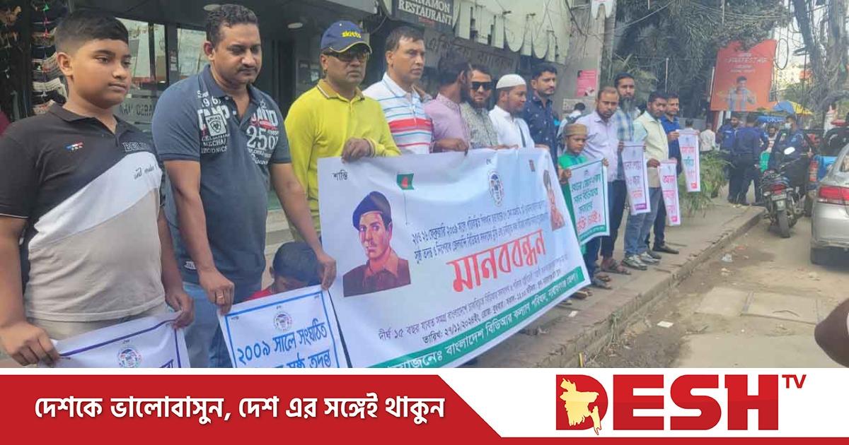 মানববন্ধনে বিডিআর হত্যাকান্ডের সুষ্ঠু তদন্তসহ নিরিহের পুনঃরবহাল ও নিরপরাধের জেল থেকে মুক্তির দাবি জানানো হয় ।
