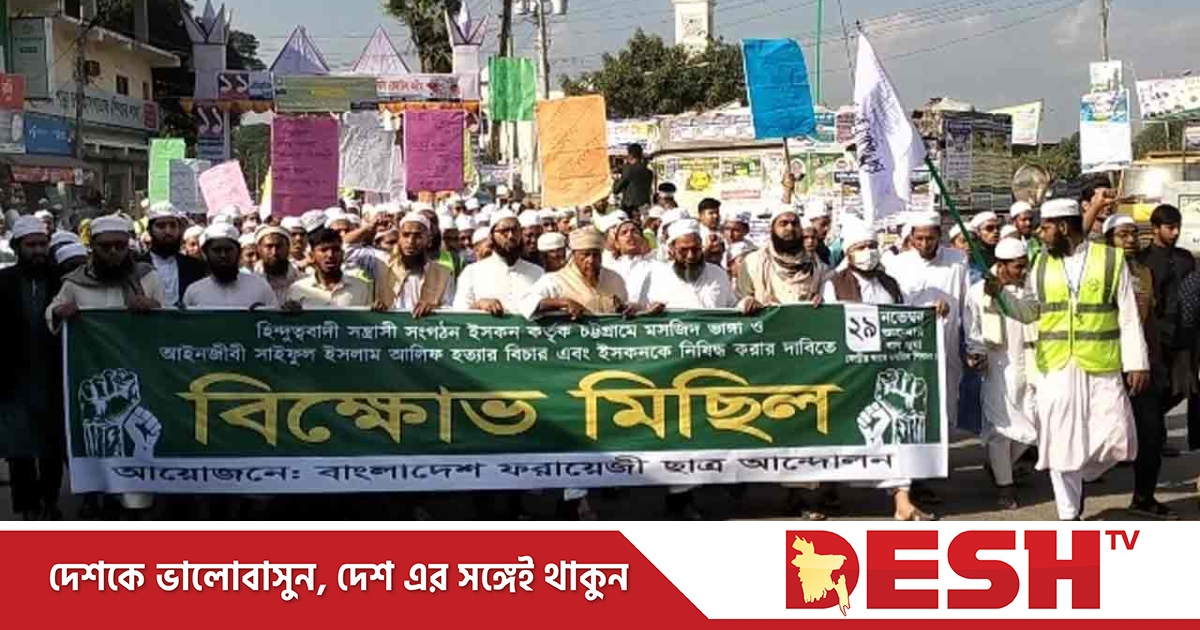 শুক্রবার (২৯ নভেম্বর) দুপুরে বাংলাদেশ ফরায়েজী ছাত্র আন্দোলনের আয়োজনে এই বিক্ষোভ মিছিল ও প্রতিবাদ সমাবেশ অনুষ্ঠিত হয়।