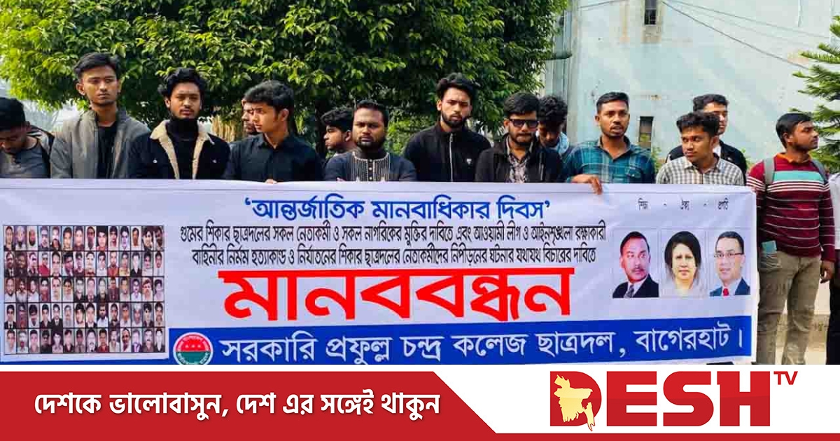 বাগেরহাটে বিগত সরকারের আমলে গুম হওয়া সকল নেতাকর্মী ও নাগরিকদের মুক্তির দাবিতে মানববন্ধন কর্মসূচি পালন করেছে ছাত্রদল। মঙ্গলবার (১০ ডিসেম্বর) সকালে বাগেরহাট প্রফুল্ল চন্দ্র কলেজ চত্বরে বিশ্ব মানবাধিকার দিবস উপলক্ষে এ মানববন্ধন অনুষ্ঠিত হয়।
