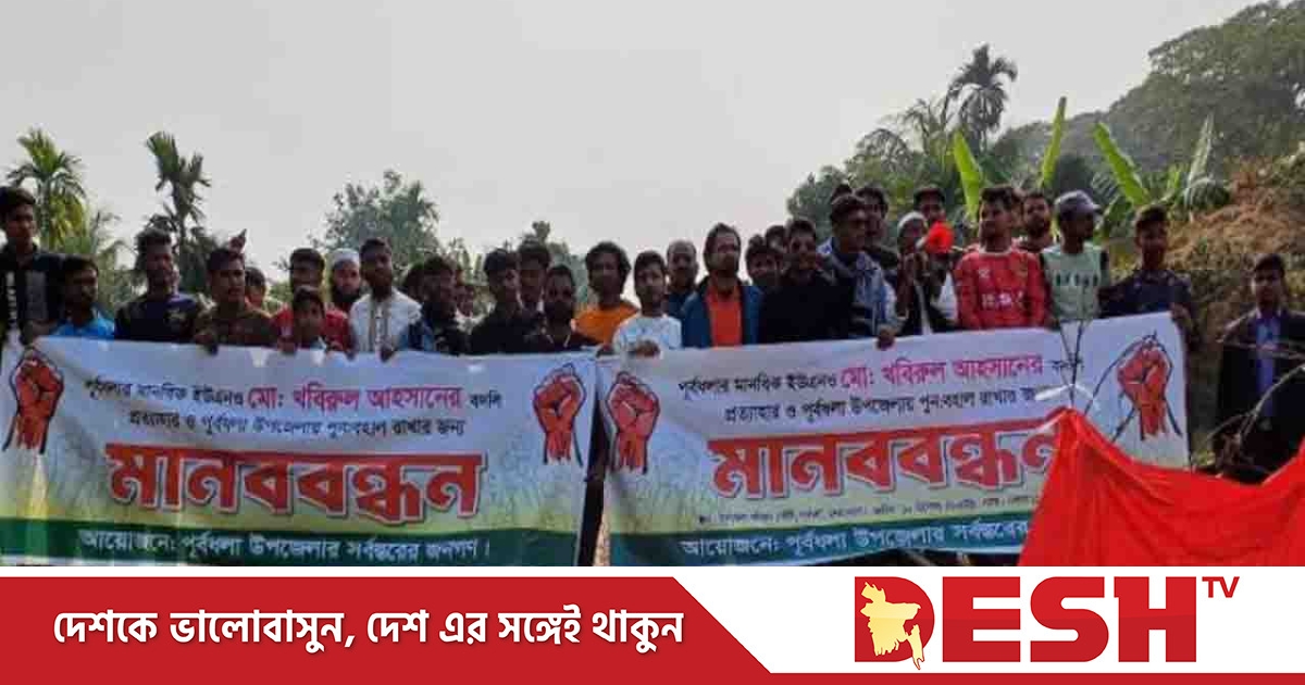 এ সময় মানববন্ধনে আন্দোলনকারীরা পূর্বধলার ইউএনওর বদলি বাতিল করো, করতে হবে। খবিরুল স্যারের বদলি, মানি না, মানবো না। কুচক্রিদের সুপারিশে, বদলি হবে না- এসব স্লোগান দেন।