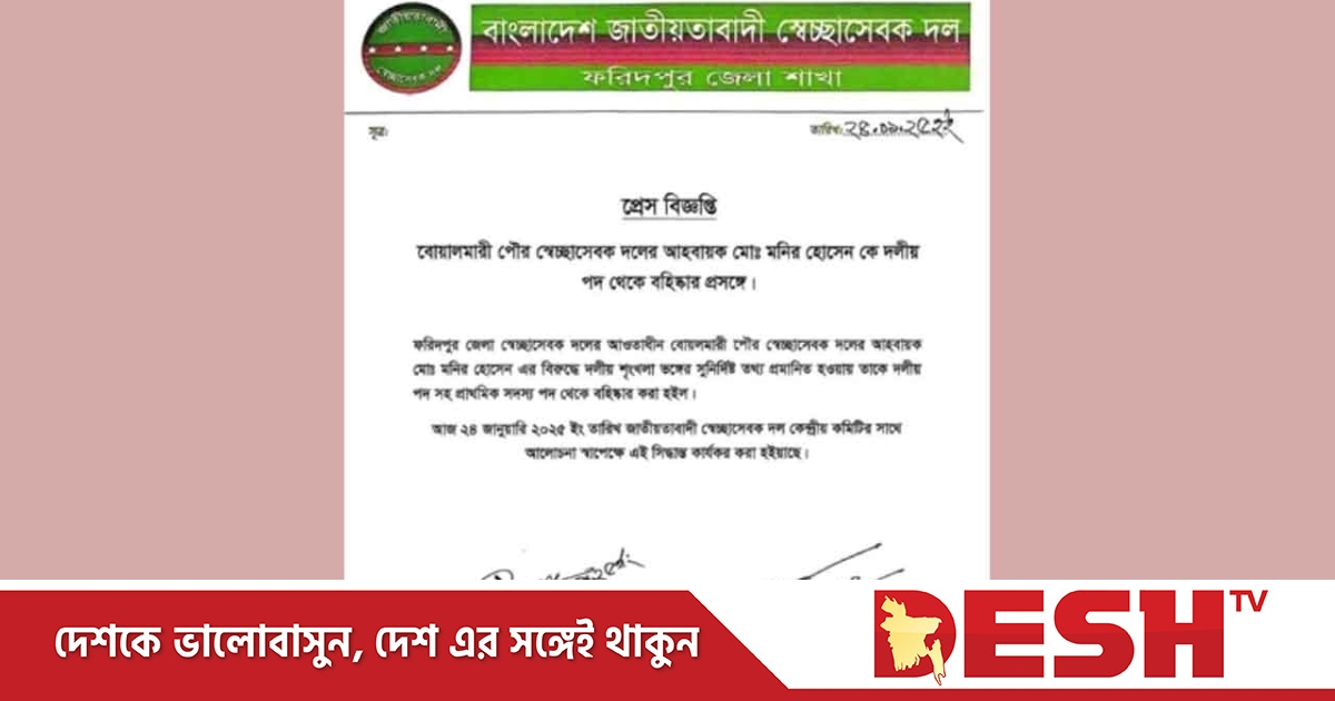 প্রেস বিজ্ঞপ্তিতে উল্লেখ করা হয়েছে, ফরিদপুর জেলা স্বেচ্ছাসেবক দলের আওতাধীন বোয়ালমারী পৌর স্বেচ্ছাসেবক দলের আহবায়ক মো. মনির হোসেনের হোসেনের বিরুদ্ধে দলীয় শৃঙ্খলা ভঙ্গের সুনির্দিষ্ট তথ্য প্রমাণিত হওয়ায় তাকে দলীয় পদ সহ প্রাথমিক সদস্য পদ থেকে বহিষ্কার করা হইল। ২৪ জানুয়ারি ২০২৫ ইং তারিখ জাতীয়তাবাদী স্বেচ্ছাসেবক দল কেন্দ্রীয় কমিটির সঙ্গে আলোচনা সাপেক্ষে এই সিদ্ধান্ত কার্যকর করা হয়েছে।