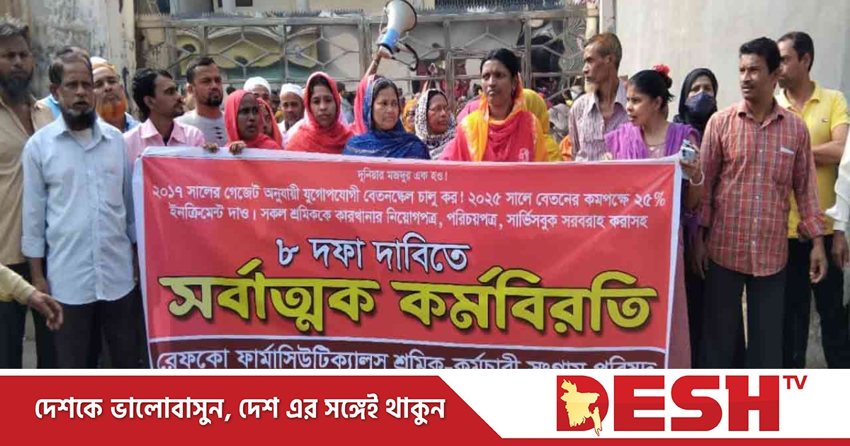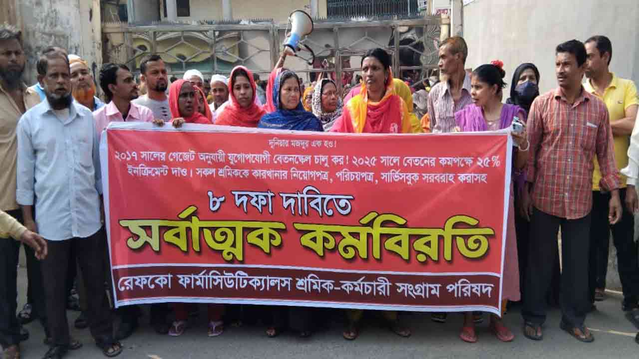 ওষুধ কোম্পানির জন্য ঘোষিত মজুরির গেজেট অনুযায়ী বেতন বৃদ্ধিসহ ৮ দফা দাবি আদায়ে বরিশালে রেফকো ফার্মাসিউটিক্যালস লিমিটেডের শ্রমিকরা কর্মবিরতি ডেকেছে।