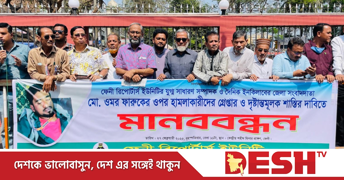দৈনিক ইনকিলাবের ফেনী জেলা সংবাদদাতা ও ফেনী রিপোর্টার্স ইউনিটির যুগ্ম সম্পাদক মো. ওমর ফারুকের ওপর সন্ত্রাসী হামলার প্রতিবাদে মানববন্ধন অনুষ্ঠিত হয়েছে। বৃহস্পতিবার (২৭ ফেব্রুয়ারি) দুপুরে ফেনী কেন্দ্রীয় শহীদ মিনার প্রাঙ্গণে হামলাকারীদের গ্রেপ্তার ও দৃষ্টান্তমূলক শাস্তির দাবিতে এ মানববন্ধন অনুষ্ঠিত হয়।