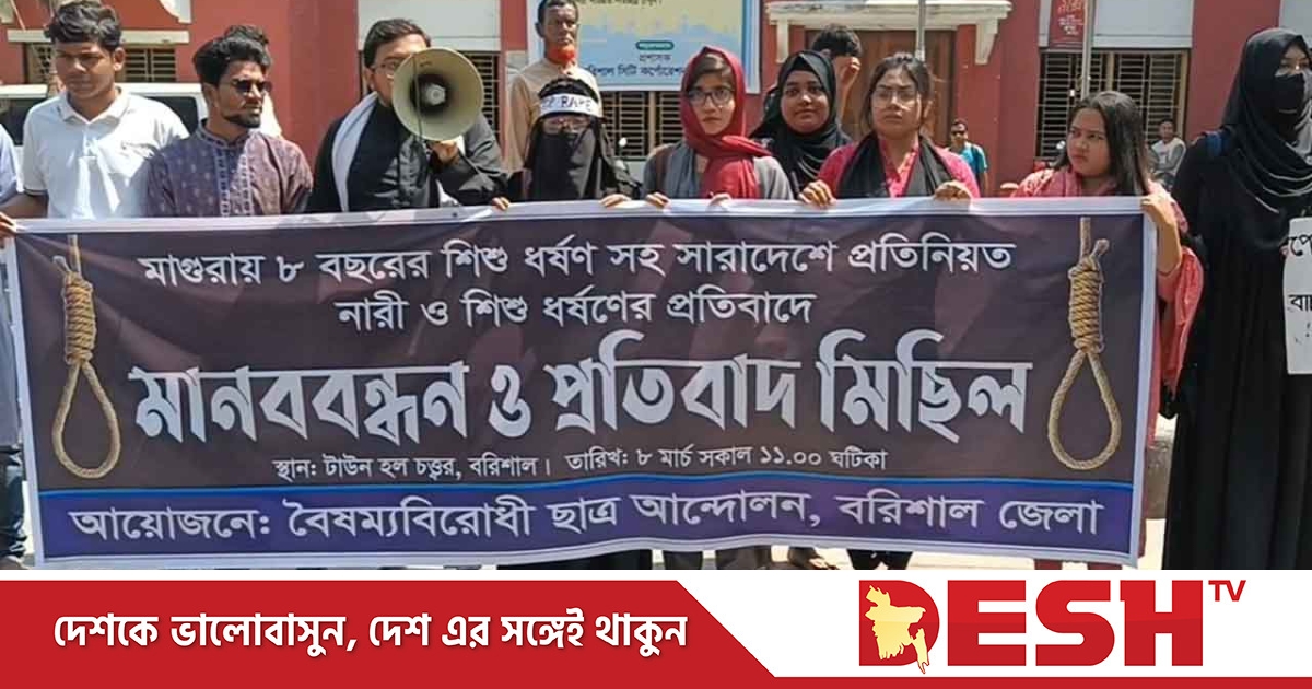 মাগুরায় ৮ বছরের শিশু ধর্ষনসহ সারাদেশে সারা দেশে নারী ও শিশু ধর্ষণের প্রতিবাদে মানববন্ধন ও প্রতিবাদ মিছিল হয়েছে বরিশালে।