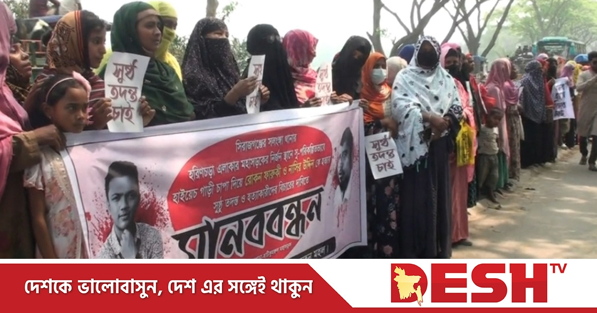 সিরাজগঞ্জে চাচা-ভাতিজাকে পরিকল্পিতভাবে গাড়ি চাপা দিয়ে হত্যার অভিযোগ উঠেছে। এ ঘটনায় সুষ্ঠু তদন্ত ও দোষীদের বিচারের দাবিতে নাটোরের গুরুদাসপুরে মানববন্ধন ও বিক্ষোভ মিছিল করেছে নিহতের পরিবার ও এলাকাবাসী।
