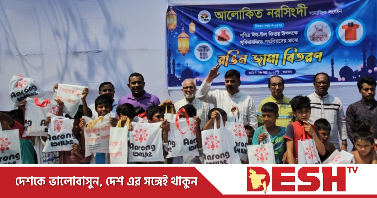 শুক্রবার (২৮ মার্চ) সকালে নরসিংদী রেলওয়ে স্টেশন সংলগ্ন পৌর পার্কে অর্ধশত সুবিধাবঞ্চিত পথ শিশুর মাঝে ঈদের রঙিন জামা বিতরণ করা হয়। ঈদে নতুন জামা পেয়ে সুবিধাবঞ্চিত শিশুদের মুখে হাসি ফুটে উঠে।
