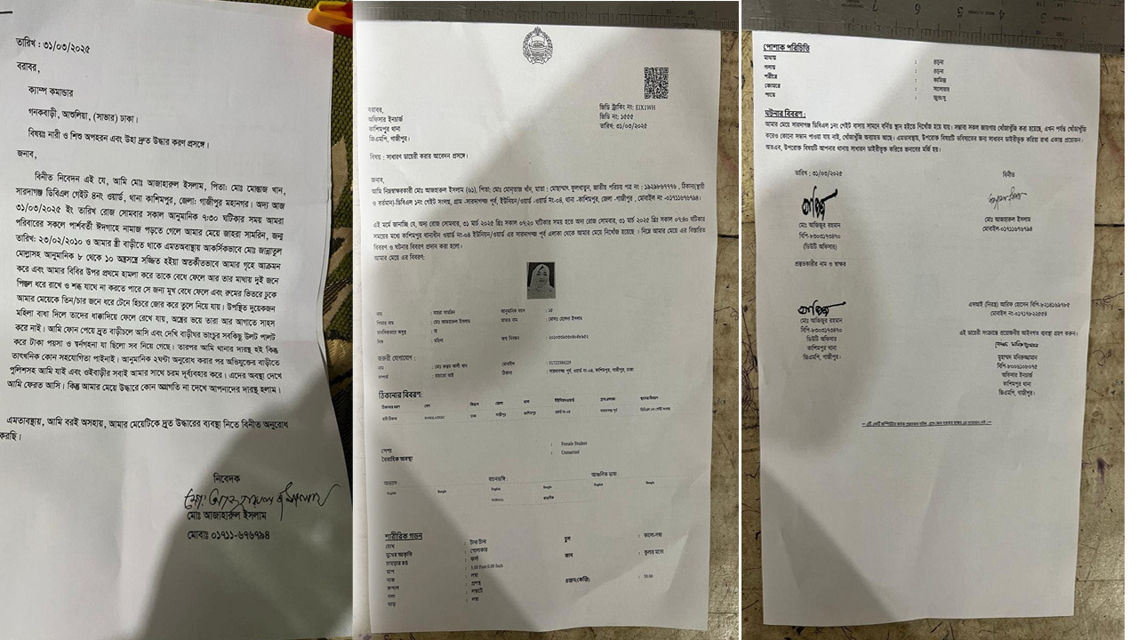 মেয়ের পিতা আজহারুল ইসলাম খান বলেন, আমি আমার ছেলে সকালে ঈদের নামাজ আদায় করতে গেলে হঠাৎ করে আমার স্ত্রী ফোন করে বলেন, আমার মেয়ে যাহারা সামরিনকে সন্ত্রাসীরা অস্ত্র নিয়ে হামলা চালিয়ে স্বর্ণ ও নগদ টাকাসহ আমার মেয়েকে উঠিয়ে নিয়ে যায়।