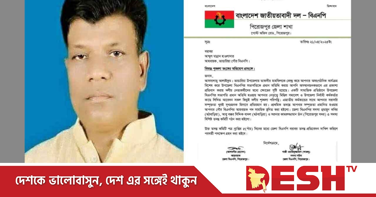 দুটি ঘটনাকেই দলীয় শৃঙ্খলা পরিপন্থী দাবি করে পিরোজপুর জেলা বিএনপি ভান্ডারিয়া পৌর বিএনপির আহ্বায়ক আব্দুল মান্নান হাওলাদারের দলীয় পদ স্থগিত করেছে। সোমবার (২১ এপ্রিল) রাতে জেলা বিএনপির আহ্বায়ক অধ্যক্ষ আলমগীর হোসেন ও সদস্য সচিব গাজী ওয়াহিদুজ্জামান ওরফে লাভলু স্বাক্ষরিত এক বিজ্ঞপ্তিতে তার দলীয় পদ স্থগিত করা হয়। একই সঙ্গে ঘটনার তদন্তে তিন সদস্যের কমিটি করা হয়েছে। কমিটির সদস্যরা হলেন - জেলা বিএনপির সদস্য হুমায়ুন কবির, আবু বক্কর সিদ্দিক বাদল ও সরদার কামরুজ্জামান চাঁন। এ তদন্ত কমিটিকে চিঠি পাওয়ার পাঁচ দিনের মধ্যে জেলা বিএনপি বরাবরে প্রতিবেদন দাখিলের সময়সীমা বেঁধে দেওয়া হয়।