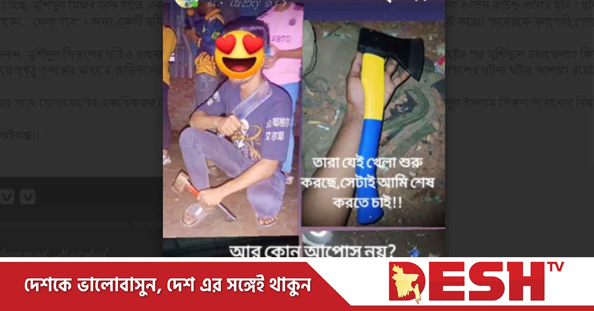পাঠানো ছবিতে দেখা গেছে, মুর্শিদুল মিয়ার ডান হাতে একটি অত্যাধুনিক ছুরি ও বাম হাতে চায়নিজ কুড়াল এবং পাশে পিস্তল ও তিন রাউন্ড গুলির ছবি। ছবির ওপর লেখা “ তারা যেই খেলা শুরু করছে, সেটাই আমি শেষ করতে চাই, আর কোনো আপোস নয়, প্রস্তুত থাকো... খেলা হবে” । অন্য একটি ছবির ওপর লেখা“ আমার বাড়ির কুত্তাগুলা,যারা ফাঁকা মাঠে ঘেউ ঘেউ করো। তাদেরকে বলতেছি, তোদের সময় শেষ হয়ে আসছে” কয় রাউন্ড নিতে পারবি তোরা, রেডি থাক, খেলা হবে”।