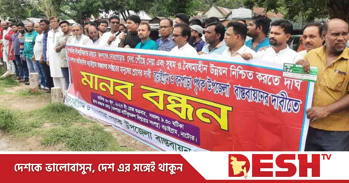 নাটোরের বড়াইগ্রাম-বনপাড়া পৃথক উপজেলা গঠনের দাবিতে শুক্রবার বনপাড়া- হাটিকুমরুল মহাসড়কের বড়াইগ্রামের রাজ্জাক মোড়ে মানববন্ধন অনুষ্ঠিত হয়েছে।