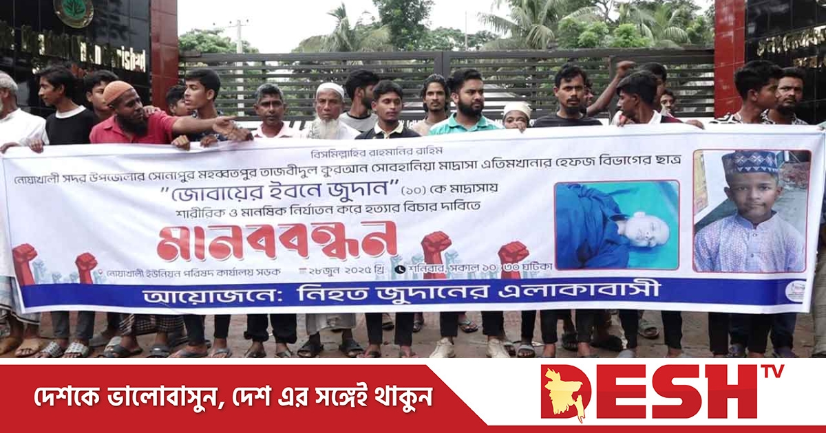 নোয়াখালী সদর উপজেলায় মাদরাসা ছাত্র জোবায়ের ইবনে জুদানের হত্যার বিচার দাবিতে বিক্ষোভ-মানববন্ধন হয়েছে।