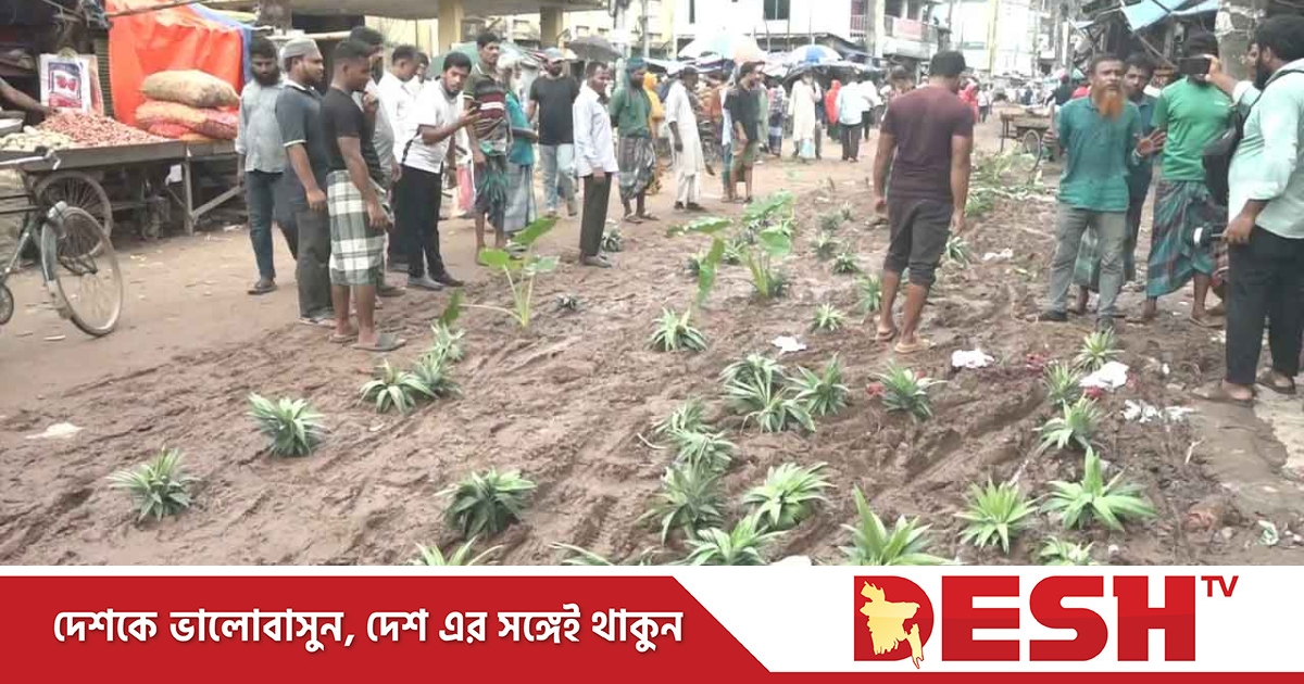 চলাচলে অযোগ্য বরিশাল নগরীর পোর্টরোড সংস্কারের দাবিতে মানববন্ধন ও রাস্তায় আনারস রোপণ করা হয়েছে।