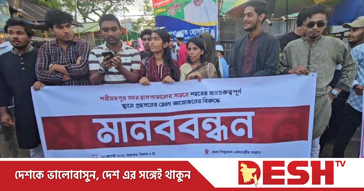 শরীয়তপুর সদর হাসপাতাল, সরকারি বালিকা উচ্চ বিদ্যালয়, শিশুপার্কসংলগ্ন জেলা শিল্পকলা একাডেমি মাঠে জেলা প্রশাসনের অনুমতিতে বাণিজ্য মেলা আয়োজনের প্রতিবাদে শিক্ষার্থী ও নাগরিক সমাজের উদ্যোগে মানববন্ধন অনুষ্ঠিত হয়েছে।