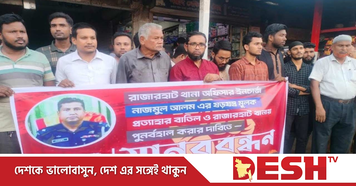 কুড়িগ্রামের রাজারহাট থানা পুলিশের ভারপ্রাপ্ত কর্মকর্তা (ওসি) নাজমুল আলম লিংকনকে কুড়িগ্রাম পুলিশ লাইনে প্রত্যাহার করার প্রতিবাদে মানববন্ধন অনুষ্ঠিত হয়েছে।