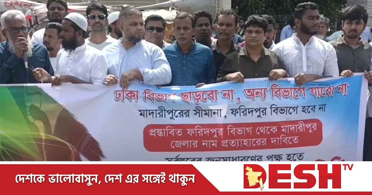 প্রস্তাবিত ফরিদপুর বিভাগের সঙ্গে মাদারীপুর জেলার অন্তর্ভুক্তির বিরোধে মাদারীপুরে জেলাবাসীর উদ্যোগে ঘণ্টাব্যাপী মানববন্ধন অনুষ্ঠিত হয়েছে।