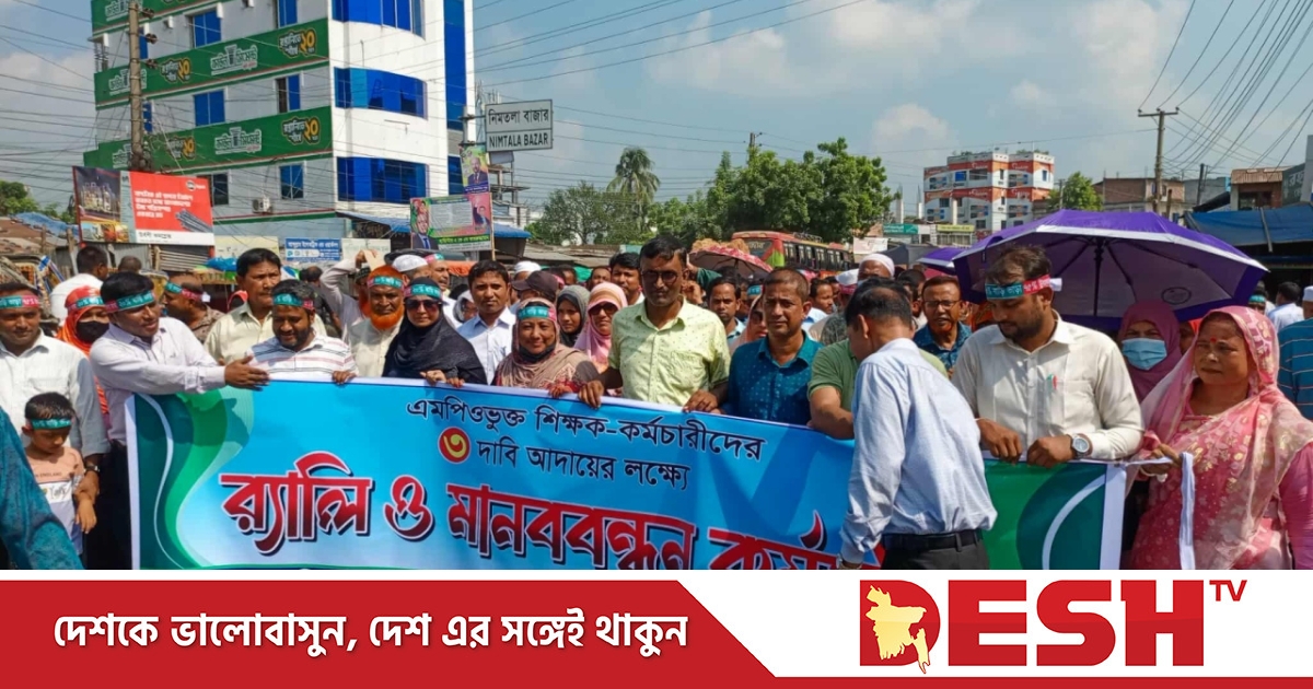 দিনাজপুরের ফুলবাড়ীতে এমপিওভুক্ত শিক্ষক-কর্মচারীরা তিন দফা দাবি বাস্তবায়নের দাবিতে রোববার (১৯ অক্টোবর) বিক্ষোভ সমাবেশ ও মানববন্ধন কর্মসূচি পালন করেছেন। সরকারের পক্ষ থেকে ঘোষিত ৫ শতাংশ বাড়িভাড়ার প্রজ্ঞাপন প্রত্যাখ্যান করে তারা আন্দোলন অব্যাহত রাখার ঘোষণা দেন।