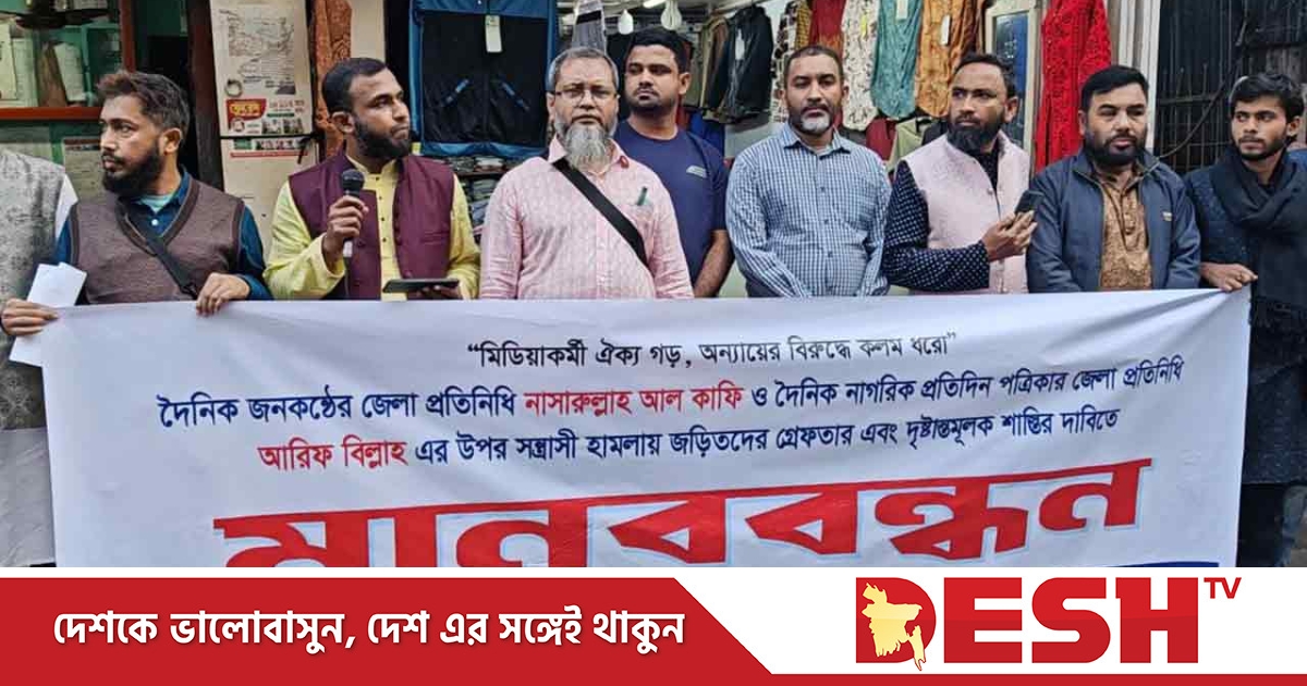 পিরোজপুরের ইন্দুরকানীতে সংবাদ সংগ্রহের দায়িত্ব পালনকালে দৈনিক জনকণ্ঠের জেলা সংবাদদাতা নাছরুল্লাহ আল-কাফী ও নাগরিক প্রতিদিনের জেলা প্রতিনিধি আরিফ বিল্লাহর ওপর হামলার প্রতিবাদে মানববন্ধন অনুষ্ঠিত হয়েছে।