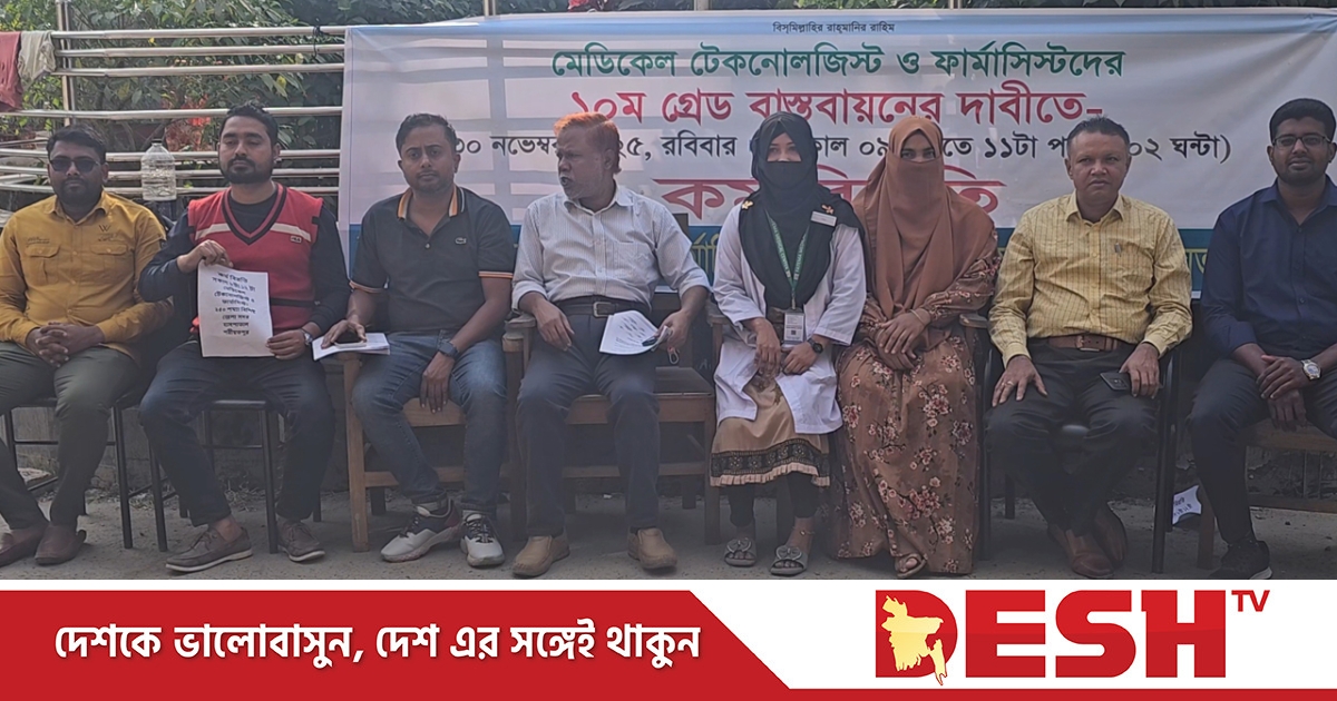 ১০ম গ্রেড বাস্তবায়নের দাবিতে শরীয়তপুরের অর্ধ-দিবস কর্মবিরতি পালন করেছেন মেডিকেল টেকনোলজিস্ট ও ফার্মাসিস্টরা।
